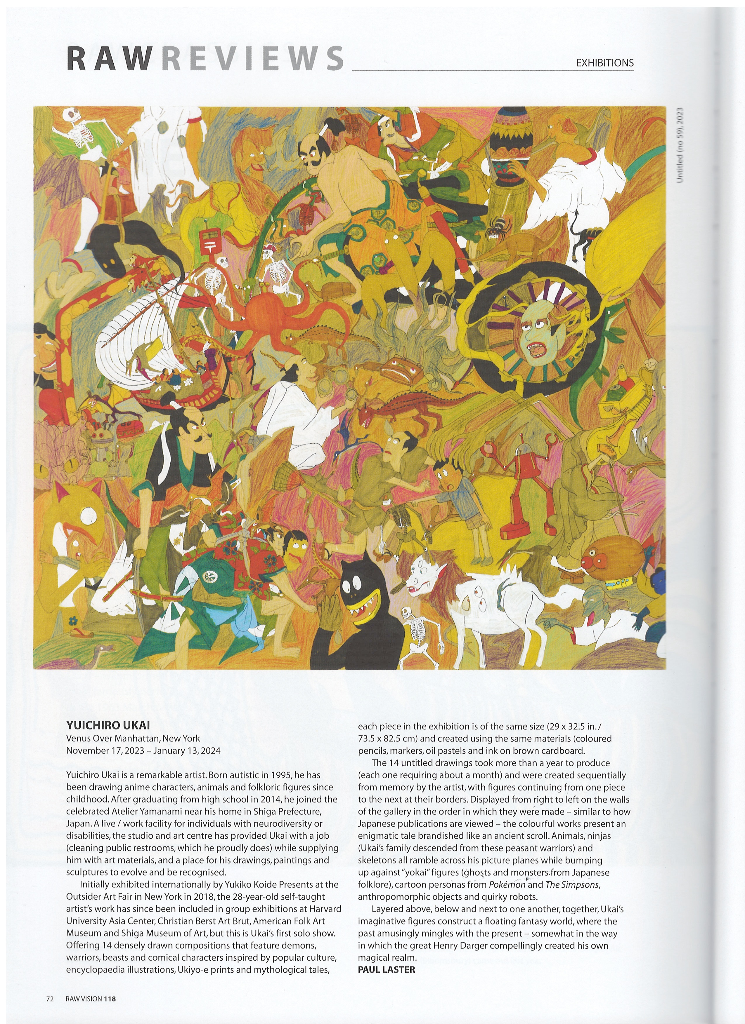 Yuichiro Ukai is a remarkable artist. Born autistic in 1995, he has been drawing anime characters, animals and folklore figures since childhood. After graduating from high school in 2014, he joined the celebrated Atelier Yamanami near his home in Shiga Prefecture, Japan. A live / work facility for individuals with neurodiversity or disabilities, the studio and art centre has provided Ukai with a job (cleaning public restrooms, which he proudly does) while supplying him with art materials, and a place for his drawings, paintings and sculptures to evolve and be recognised.
